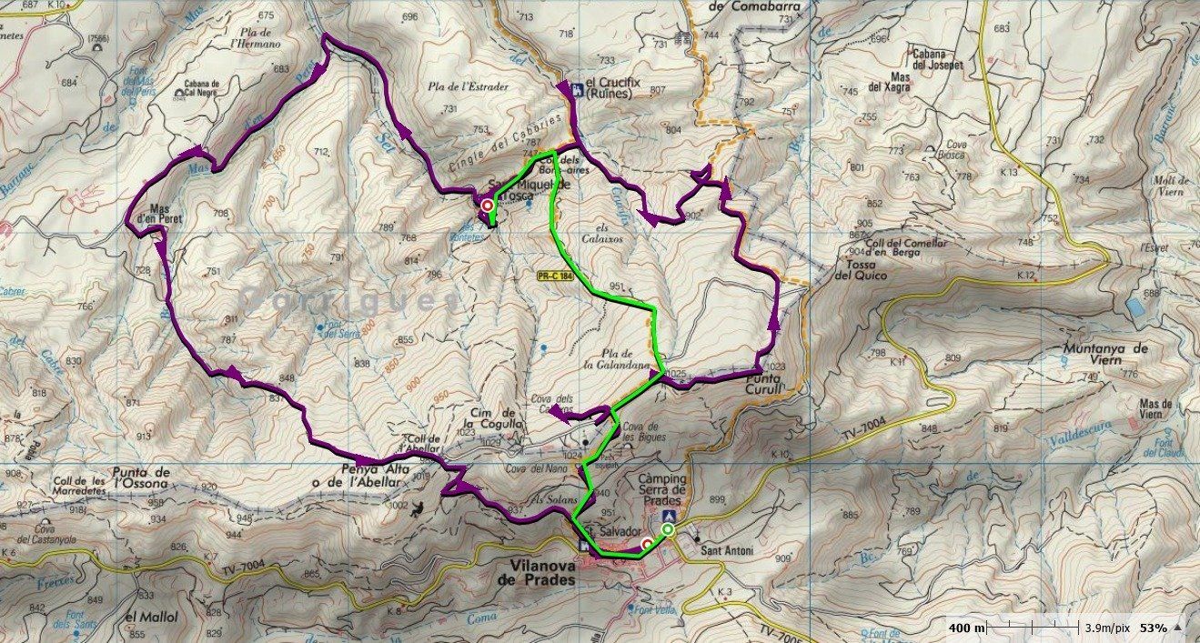 Distancia y desnivel: unos 15 km y unos 700 m. Existe una variante más corta (ver imagen con el trazado en verde).